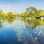 翠湖公园位于昆明市区北部,云南大学对面,是昆明市区环境优美的城市公园,也是很多游客在昆明市内游玩的好去处。这里湖水碧绿,树木、荷塘典雅优美,冬季时还可以喂养、拍摄成千上万的红嘴鸥,趣味十足。翠湖公园以翠湖为中心,纵贯南北的阮堤和直通东西的唐堤,将翠湖分成五片景区;湖心岛景区以湖心亭和观鱼楼等清代建筑为主。湖心亭又叫“碧漪亭”,飞檐黄瓦造型美观,亭内有前后两个内院,平日里为各种展览举办之地。东南面是水月轩和金鱼岛;东北面是竹林岛、九龙池和知春亭,逢节便有人聚此对唱山歌,别有一番风情。堤畔垂柳拂面,湖内藕荷飘香,岛上亭台楼阁,将翠湖点缀的秀丽清新。秋天是赏枫好时节,翠湖公园从十月下旬开始,枫树就会慢慢变红,从金黄相间的枫叶到深红的枫叶也许只是一夜之间。这里的红枫林层层叠叠,与湖水交相辉映,形成唯美的秋日画卷。每年立冬时分,成千上万只红嘴鸥会从北方飞来在此越冬,这个时候是翠湖公园热闹的时候,市民、游客集中在此,投食喂鸟,与红嘴鸥互动,其乐融融,和谐的场面为翠湖公园增添了无穷乐趣。逛完翠湖,公园外环绕的四条街(翠湖东路、翠湖南路、翠湖西路、翠湖北路)上布满特色小店、咖啡馆和酒吧。你既可以环湖走走,度过一个悠闲的下午,也可以在夜幕降临时,融入到灯红酒绿的夜生活中。此外,翠湖公园附近有云南讲武堂旧址、云南大学等,可一并游玩。