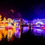 98个特色主题灯组融合现代、古典、建筑、海宁文化等不同元素,体现海洪宁静、人杰地灵、鱼米之乡主题,10余组大主灯涵盖传承与创新、碰撞东西方文化。入园观赏,特色大型灯组屹立细水之上,做工精细令人惊叹;环顾四周,各色风格灯组竞相争彩,营造炫彩世界。