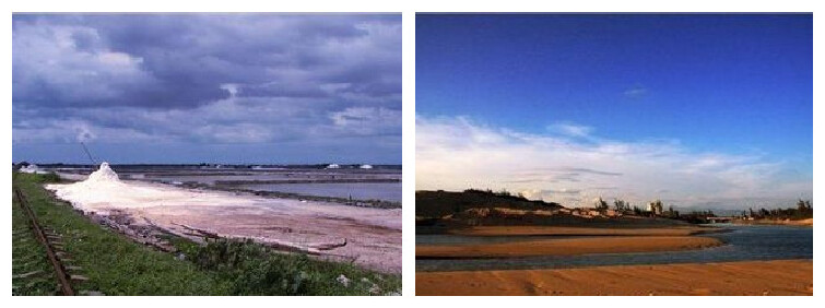 地图来到莺歌海盐场, 首先映入人们眼帘的是一望无垠的银海。这里,渠道纵横整然有序,井 井盐田银光闪闪,高压电线凌空飞架,水泵房池星罗棋布,制盐机械转动轰鸣,处处呈现一派生产繁忙的景象。莺歌海盐场建在海山之间,尖峰岭的连绵群山挡住了来自北方的台风云雨,使这里长年烈日当空,有充分的光热进行盐业生产。加之这里的海水 含盐度高,这样便造就了得天独厚的生产条件。