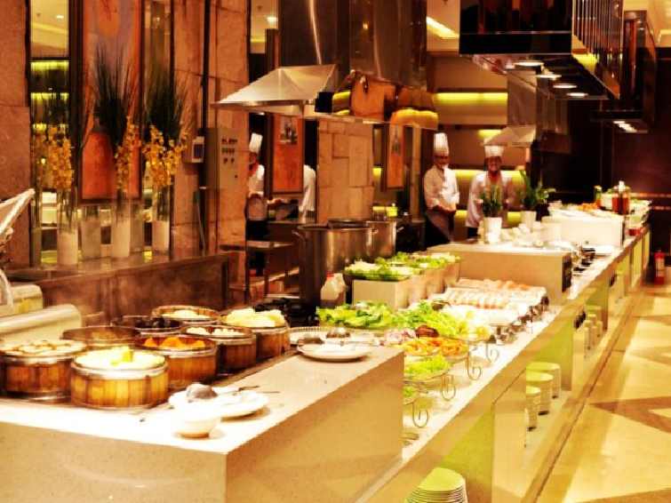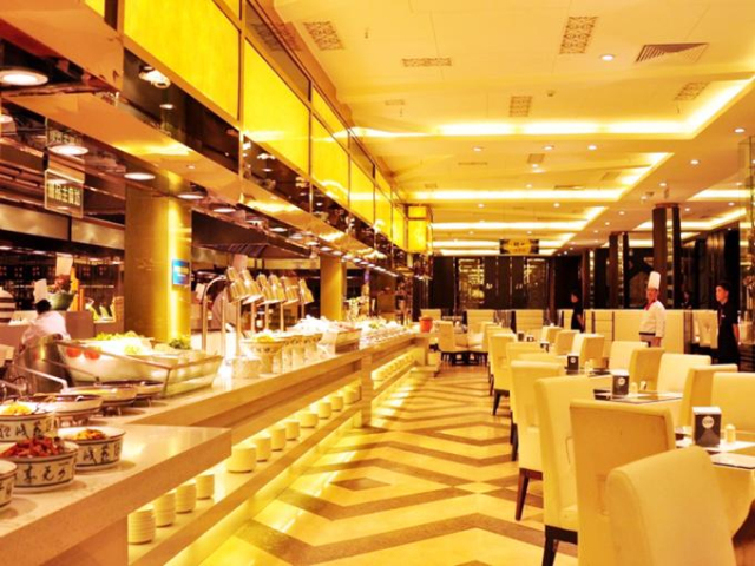 敞开式纯明档自助餐厅:面积达1000多平方,同时容纳350人就餐。中西合并,不一样的美食环境,店内集结了顶级的中西菜品自助、多功能宴会厅等餐饮商务设施,酒店式餐饮模式。