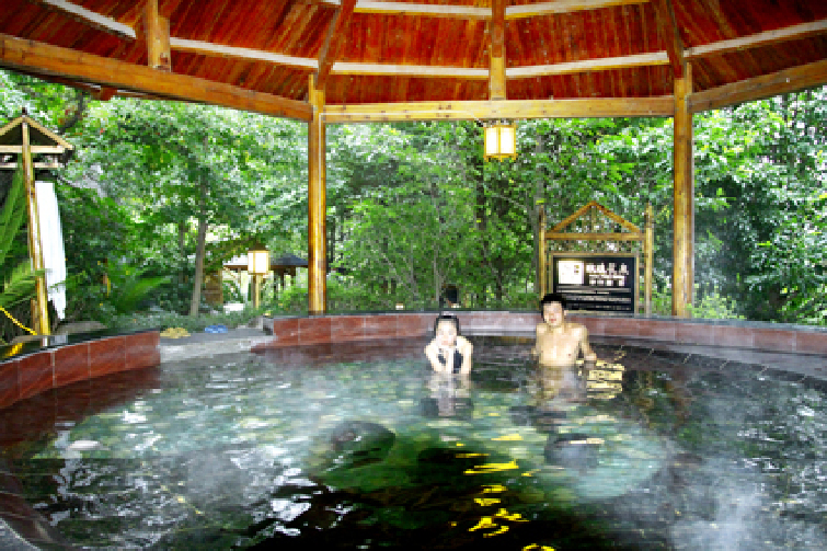 露天温泉依山而建,依偎在山的环抱里,周遭绿树掩映,眼前泉雾缭绕,令人心旷神怡。整个温泉区分为动态水上乐园区和静态泡池区,六十余种功能各异的温泉泡池散落山间,任君选择,可同时容纳3000人沐浴;动感十足的水上乐园令人欢乐无限,流连忘返。