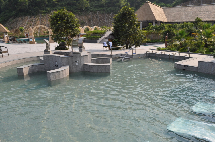 度假村位于新丰县50万亩原始森林中,两山峡谷之间,以高山密林为主,地形狭长,山势奇特,层峦叠嶂,林木茂盛,清澈溪水贯穿其中,负离子浓度高达每立方厘米10万个,是一般景区的5至10倍。“温泉娱乐区”占地100多亩,温泉池60多个,包括大泳池、全进口设备娱乐池、儿童池、按摩岛、地热石板、各种功能花浴、药浴等,均采用高档的天然大理石为主要装饰材料,布局合理,设计独特,休息亭采用乡村茅草屋模型,东南亚风格。温泉日出水量2000立方米,含有丰富的多种矿物质、微量元素,还有可达瘦身效果的“氡”元素。