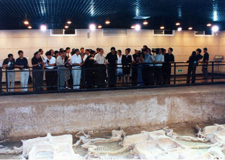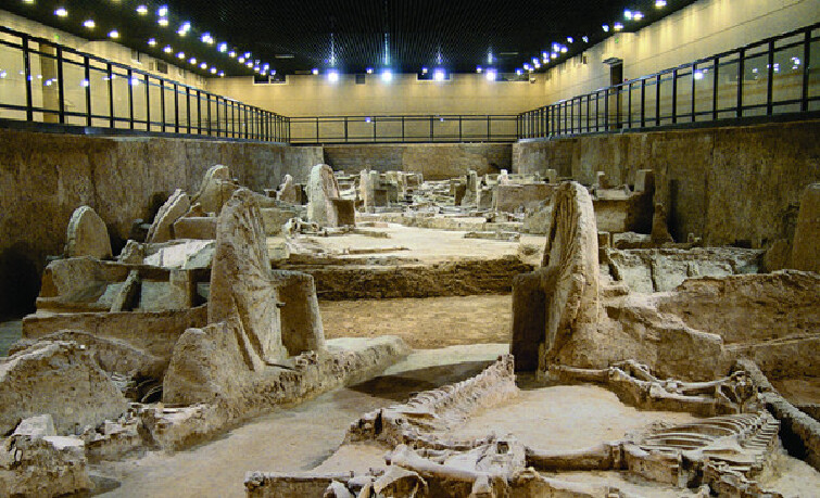2002年, 考古工作者在东周王城东部,即今周王城广场,发现了397座东周时期的墓葬和18座车马坑。其中规模最大,蔚为壮观的一座车马坑南北长42.6米,东西宽 7.4米,共清理出了26辆车、70匹马、7只狗和一具人的骨骼。在这座车马坑里不仅发现了多辆驾二车、驾四车,还发现了罕见的天子驾六车。