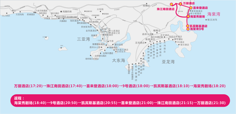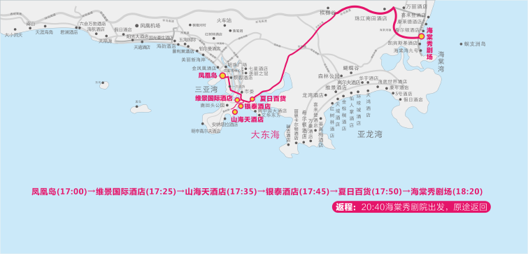 凤凰岛→维景国际酒店→山海天酒店→银泰酒店→夏日百货→海棠秀剧场
