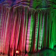 水晶宫是一个晶莹剔透的世界。这里就像一个无比宽敞的艺术迷宫,金碧辉煌,四通八达,可容几万人。仰望洞内顶倒挂着的水晶钟乳石,如宫灯五彩缤纷,如宝剑寒光四射,如神塔银光闪闪,如彩虹飞架苍空,如北斗众星拱月,如牛郞织女鹊桥相会,如齐天大圣云端翻腾……环视洞内,四处水晶钟乳罗列,有如石林胜境。其中,有龙盘虎踞石城,有李白举杯邀明月吟诗,有嫦娥舒袖奔月,有三姐歌台对歌,有神佛修身养性……千姿百态,栩栩如生,此乃天下第一奇观。慢慢观赏,细细品味,你会领悟:艺术的魅力在于自然,而山水之奇妙却在于气韵天成的艺术。