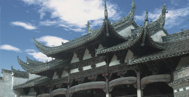 徽州古村落的马头墙分为三层,前后五个“马头”,称“五岳朝天”。而龙川民宅的马头墙多为两层三个“马头”,这是因为龙川后枕之山发脉于“三天子都”,所以用三不用五,称之为“三台聚瑞”,也是一大特色。马头墙分为两种样式,这顶上砌成上方下圆,状如朝天官印,俗称朝天印,反映了徽州人对仕途的向往与追求,是文官的象征。这两头翅起的叫喜鹊尾,形式宝剑,是武将的象征。