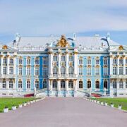 叶卡捷琳娜宫是一座两层楼高的宫殿,正面长达300多米,主要由蓝、白、黄三色构成,据说这分别代表着女主人蓝色的眼睛、白色的皮肤和金黄的头发。建筑师加建了皇宫教堂及作为行政管理之用的厢房,顶部加盖上五座金碧辉煌、颇具特色的洋葱形圆屋顶。