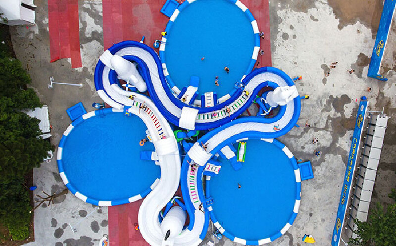 冰雪世界以白色和浅蓝色为主,给炎炎夏日游玩的人群带去凉爽的视觉感受,仿佛置身于冰天雪地之中。乐园中配有一个充气水池,水池中放些水上浮具,让现场的玩法更加丰富。在造型上同时融入了多种元素,如企鹅、北极熊、冰雪小屋等,造型异常逼真。