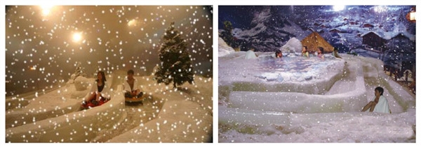 ★★ 晚上21:00-21:30分之间,还可体验全国首创的飘雪温泉,飘雪温泉利用先进制冷技术开发建成,飘雪的部分大概一个300多平方米的空间,9个大小、温度不同的池,温度在38℃~42℃之间。室内的温度只有零下8℃~10℃,在这样的温度这样的场景中,游客可以全身浸在温泉水中,安静地看“雪”,可以一边享受温泉,一边感受雪的美丽。更特别的是一个瀑布温泉,瀑布是从山上倾泻而下的山泉水,冰凉清澈,地下是温热的泉水,站在瀑布底下,任由山泉水拍打在身体上,双腿淹没在热水中,感觉也很特别。