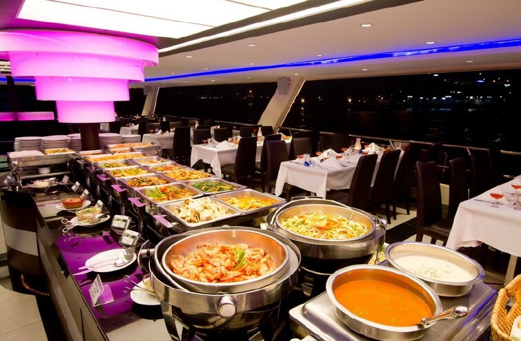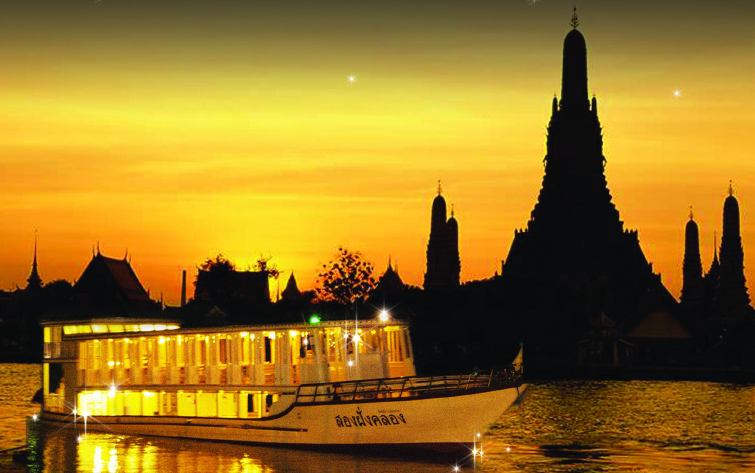 坐在船上,你一边用餐,一边欣赏「湄南河」两岸的景色,船大概是五点半左右会出航,或许是季节的关系,出发时天色还是蛮亮的,所以 也就没有看到湄南河两侧的夜景。在河的两岸,可以看到许多知名的大饭店,像是香格里拉、半岛酒店、皇家兰花喜来登等都一一伫立在河的两旁向你致敬,也会看 到一些泰国知名的建筑物,比如说郑王庙、拉马一世纪念桥等,甚至还能看到泰国的海军基地和他们的炮艇,也都在河的两岸。河上除了有大汽船之外,还可以看到 一般市民上下班所搭乘的「长尾」型的马达汽艇以及货船。