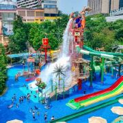 地图宏伟的重庆玛雅海滩水公园,无数盘旋而上的阶梯和滑道连接起碧波荡漾的水面和错落相交的玛雅古屋。滑道上缠绕的藤蔓、涌出的清澈“圣水”、冲淋上刻满着玛雅文字,这是一所水域中的"玛雅天堂",享受异域风情中那清凉畅快。集翻斗桶、滑道、攀爬网、泼水等多种戏水娱乐,让狂欢、戏水、活动融为一体,不同的戏水滑道和玩水项目,大人孩子都会乐在其中共享欢乐。