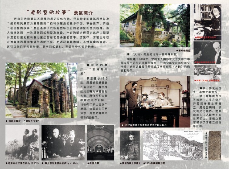 老别墅的故事景区六栋别墅个个故事精彩,其中百年老教堂堪称“石头的史诗”。庐山会议期间,这里是中央领导人的舞厅,毛主席、朱德、周恩来、刘少奇等都在此跳过舞。如今游客可在此观看或参与典雅的西式婚礼;“李德立展馆”演绎23岁的英国传教士空手套白狼成为地产大王的传奇故事;“塞珍珠别墅”是诺贝尔文学奖获奖小说诞生的地方;老别墅酒吧,李德立曾是这里的常客,塞珍珠曾在这里给徐志摩写过信,庐山会议期间,这里成为中央领导人的餐厅。