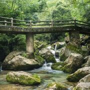 青城后山的宫观香火虽无前山之盛,而清幽洁净则更胜一筹,有“一山幽意论平分”之说,自然风光迷人。沿山道而行,山花烂漫,飞瀑流泉不绝;峭壁悬岩,天光云影一线;忽而栈道逶迤曲折,不见头尾;忽而村落群山环抱,绿草如茵。