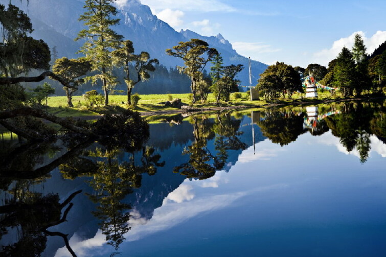十二仙女峰,峰峦秀丽,形如仙女婷婷玉立一侧,与伍须海遥相辉映,每当晨曦为露,薄雾轻泛,湖面一片蒸腾,人们称“仙女早洁”。夕阳西下,十二仙女峰倒映于湖中,如入仙境,人们称“仙伍须,藏语意为问阳的好地方,距九龙县城25公里。相传,伍须海里住着一位美丽动人的仙女,与海子对面的东热吉布雪山是一对衷情恋人,这对恋人与居住在海边的群众关系十分融洽,群众每年都要烧香,熏烟祭海,祭把东热吉布,他俩亦有求必应,悉心保护着当地的生灵。