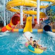 青岛东方影都融创水世界以海洋元素为亮点,入园即见一艘巨大“游轮”,两侧分别为岩石岛与冲浪湾主题区域,拥有龙卷风暴、巨浪湾、超漩组合、竞技滑梯等十余款明星游乐项目,水世界是室内乐园,恒温不怕晒,游客们无论什么时间都能享受亲水的欢乐。当200米巨幅看海落地窗将海天一线搬进你的瞳孔,当户外浪摆海岸的水花在脚尖绽放出夏日的狂欢,青岛东方影都融创水世界邀你共赴一场蓝色心跳之旅!