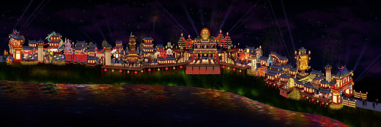 是以三个水面为核心构成的展演中心,两侧水面为大型水上灯组《锦鲤绕荷》和《万家灯火》,中间为水舞台,通过水面、陆地、空中、山体四维一体背景,打造集光影、水景、巡游、烟花为一体的大型光影主题秀.