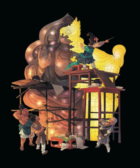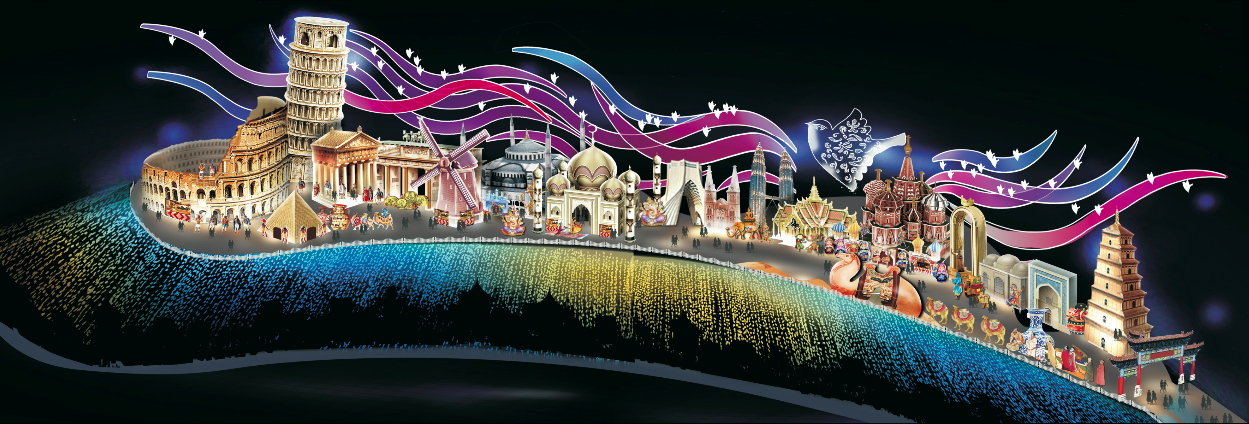 以“丝路之路”沿途地标建筑为场景,大型山体群组式彩灯贯穿长安到罗马的恢弘画卷。前方山体用彩灯铺装,从黄色渐变蓝色象征着从沙漠到海洋;空中绸彩点缀和平鸽,翅膀开合、明暗变化,宛如群鸽飞驰。从东到西依次构建长安、俄罗斯、波斯、罗马和非洲场景,场景中代表性建筑物灯组与特色商品售卖、异域歌舞演艺,让游客沉浸式体验各国风情。