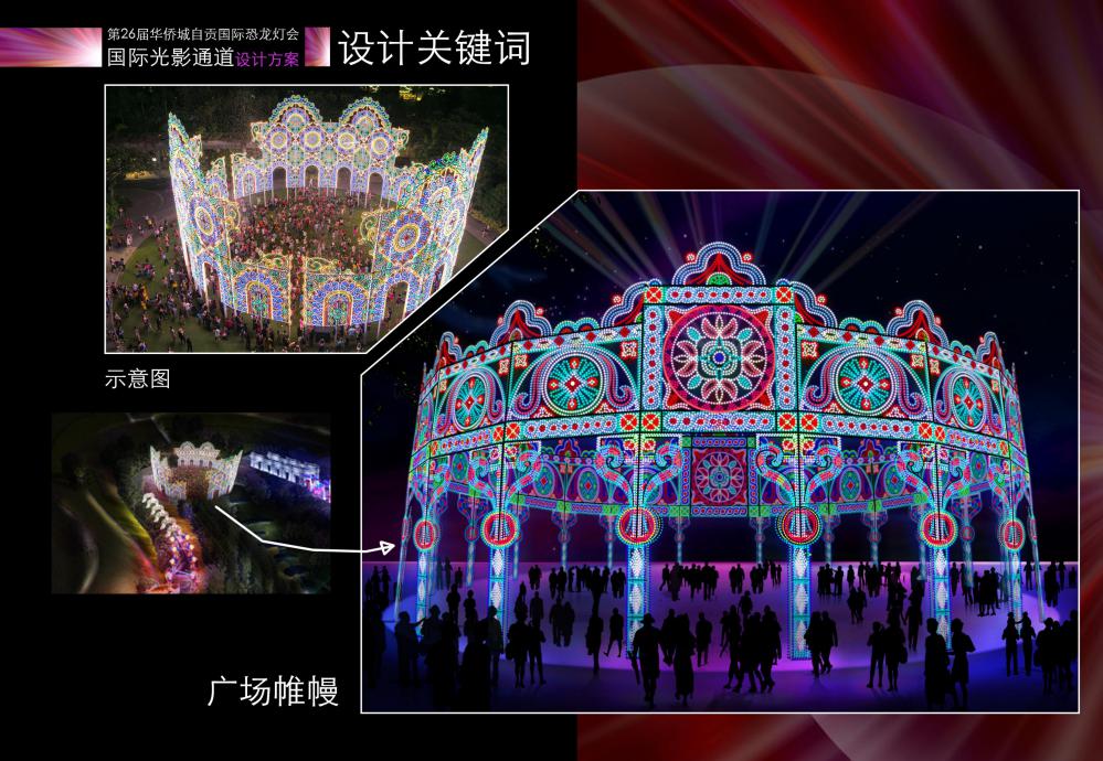 第26届自贡国际恐龙灯会以“自贡灯·耀世界”为主题和愿景,首次创意融合传统彩灯技艺和现代光影科技,突破原有灯会场地的制约,充分利用山脊起伏、水路蜿蜒的地势地貌,从水上、陆地、空中的视角全方位、多维度、立体化地打造锦绣盛世、南国华灯、上元灯火、中华彩灯、一带一路、灯耀世界、童话城堡、时空龙骑士等九大主题区域。策划主题灯组、构建沉浸场景、注入国际元素、升级互动体验、融合情景演艺、汇聚百味美食。讲述中国故事,链接世界文明。