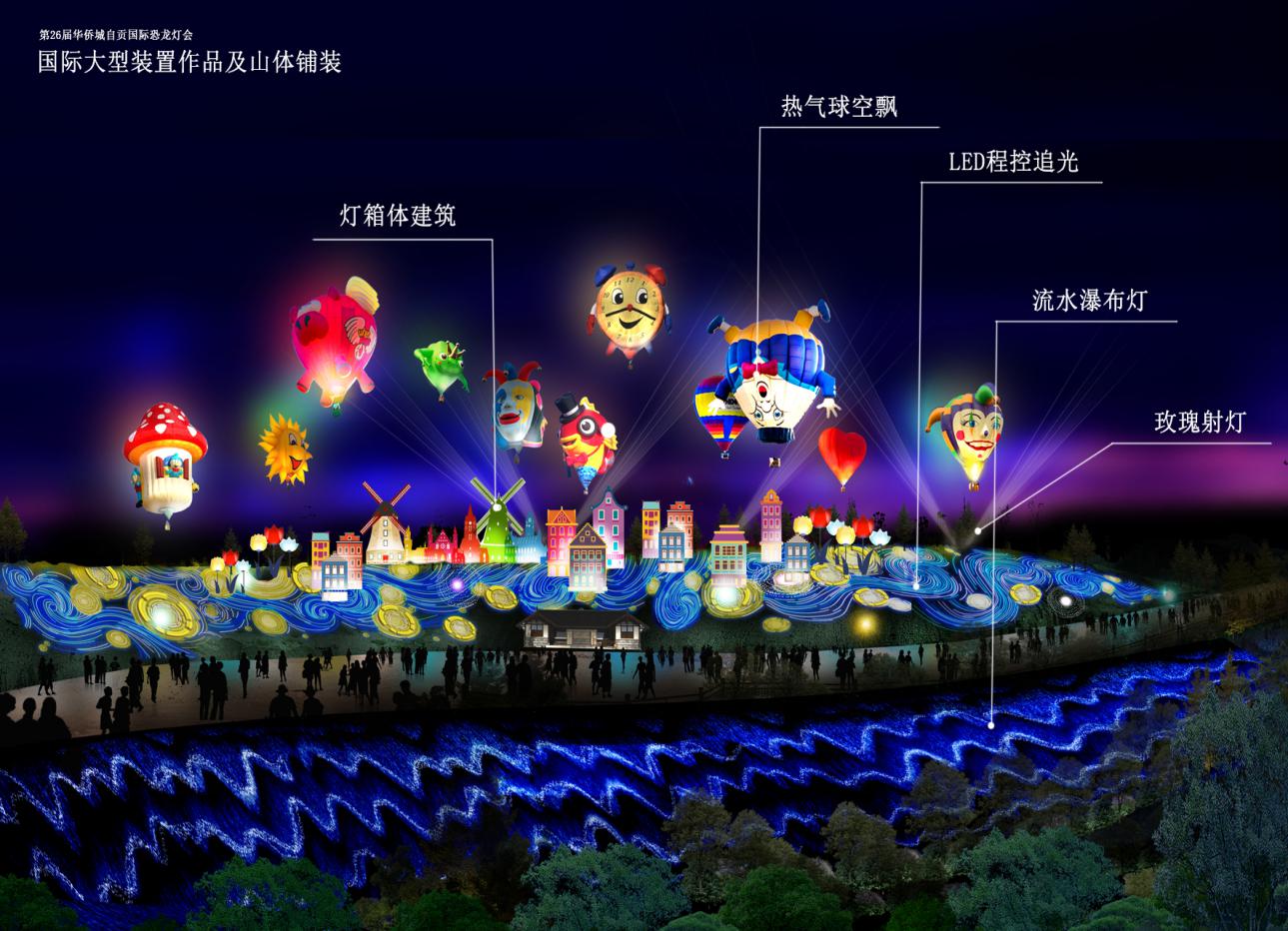 以现代光影展现国际代表性的城市风貌、奇特人文内容,以新颖形态为形式,展现世界光影作品,给26年来的传统灯会首次注入了国际符号,也让"国际"二字名副其实。借鉴梵·高《星月夜》为设计蓝本对山体进行整体灯光铺装,弯曲的长线、破碎的短线,使整个山体充满连续不断的、波浪般的运动感和空灵感,出的星空奇幻景象。山体上方巨大的热气球,宛如色彩斑斓的巨大灯笼,忽明忽暗、美轮美奂。兴奋的天使来到了欧洲17世纪初至18世纪上半叶繁复夸饰、富丽堂皇、气势宏大、富于动感的巴洛克建筑艺术境界《广场帷幔》,用多彩的调色板绘制出人间五彩斑斓的《合欢树》,看着人们走进梦幻奇异的合欢树林,天使们又飞向了那令人神往的《罗马记忆》(丝网灯工艺)。灯耀世界主题区还汇聚了数十件集科技、美学、人文、体验于一体光影艺术作品,呈现灯光新颖独特的视觉传达。《炫酷旋律》、《魔幻光球》、《泡泡树》、《新年礼盒》、《魔音盒》、《发光多米诺》(西班牙)、《表演舞台》、《万花筒》(法国)、《汽车鱼缸》、《欢乐云》(台湾)、《曲艺人生》、《钢琴》(法国)、飞吻(法国)、《动物总动员》(法国)、《微笑》(西班牙)......每件作品都有新奇互动玩法,等你发现。