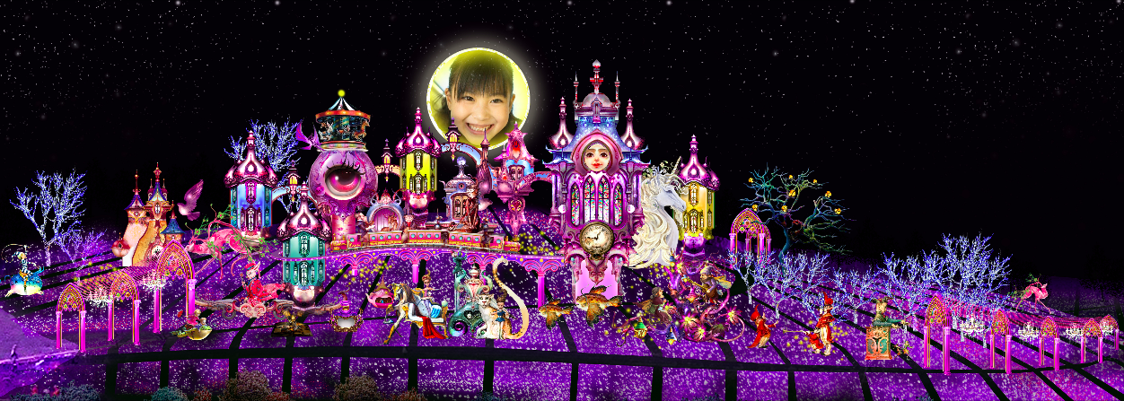 依托山型地势,以连绵的童话城堡塑造一片魔法色彩的天际线,其间配合各种童话主题内容灯组,构成一片梦幻童话空间。乘坐着神秘客人、围绕城堡缓缓行驶的《寻梦环游列车》,当懒人钟敲响、公主推窗而出的《睡梦人》,缓缓眨眼带你进入奇幻之境的《梦眼》,婀娜着身体、马蹄摆动的《守护兽》,在城堡窗台上守望蒙面主人的《守望的蒙面狐狸》,在丽花树上创作世界之歌的《民谣精灵》,需大家合力翻阅的《立体魔法书》,浮力城堡中人脸采集点并投影到《月亮》上,《飞行鱼魔力团》、《斑纹曲角兽》、《吹泡泡》等,童趣无限。