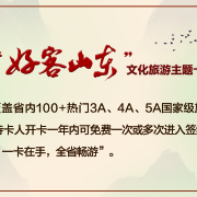 超值划算,任性旅游,“好客山东”文化旅游主题卡,覆盖省内100+热门3A、4A、5A国家级旅游景区,景区有文化古迹类风景名胜类、自然风光类、红色旅游类等多种类型,持卡人开卡一年内可免费一次或多次进入签约景区。