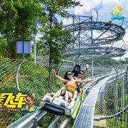 峡道飞车全长3680米,犹如一条天路盘旋在巍峨的古龙山脉之上,跨越3座山峰,依山取势,蜿蜒起伏,一弯接一弯,全程落差高达260米,时速可达30km。赛道设计融合了多种复合型弯道,包括多个直角弯、发夹弯、360度螺旋弯、8字回旋弯等28个极具挑战性的弯道。其中“9连发夹弯”超越了以“5连发夹弯”闻名世界的秋名山赛道,是目前国内长、弯道多的山道滑车项目,九曲二十八弯,实至名归。
