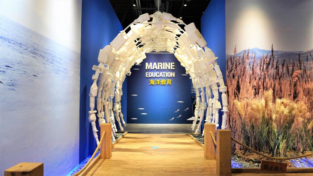 以海洋废弃物再利用打造而成的鲸鱼骨造型拱门,是馆内具代表性的网美打卡点。透过创意设计传达海洋保育理念。