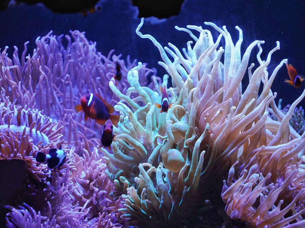 色彩绚丽的珊瑚和鱼共生的精品展区,有小丑鱼、海葵、海胆等种类繁多的海洋生物。
