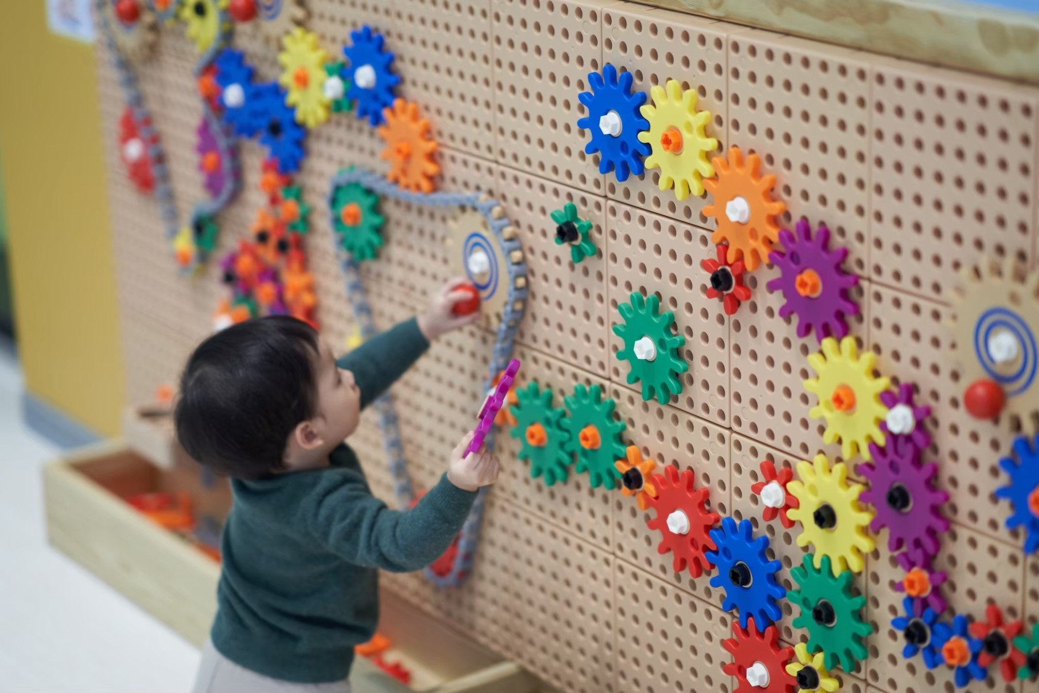 “多乐比互动游戏区”让小朋友透过不同的积木组件,练习空间感与美感,齿轮墙教具则利用简单的机械原理,让小朋友了解许多事物的运作规则与布局规划!
