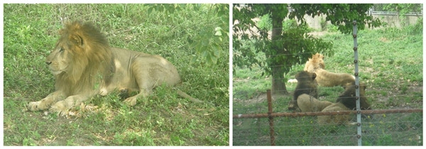 本园狮区现有30头成年和14头幼狮。展区内你看不到动物的笼舍,没有都市里的喧嚣与污染,也没有水泥森林的压迫感,只有满目的青翠和回归大自然的静谧与清新。对每一位游客来说,乘坐游览大巴,深入到食肉动物自由出没的原野、丛林,是一种充满着恐惧和刺激的历程。进入非洲狮展区,非洲狮威武的形象即刻映入眼帘,颈部与肩部披着长长的黑褐色鬃毛的雄狮常常有让人心惊胆跳的感觉。
