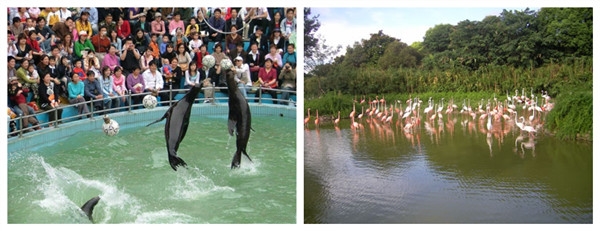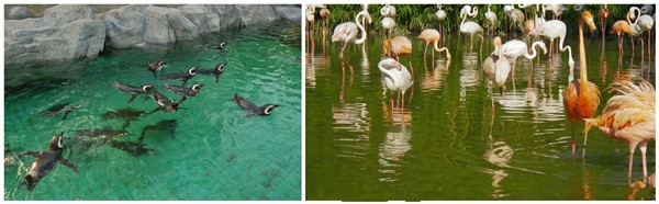 火烈鸟展区位于正大门口,共展出88只火烈鸟,有迎宾小姐的美称,红色的是美洲火烈鸟,粉红色的是欧洲火烈鸟。它们有“Z”字形的长颈和镰刀形的长嘴。此外它们还有一双蜘蛛般的长腿,颜色发红。它们有着独特的淡朱红色的羽毛。远远看去宛如一团火球。所以又有“火鹤”之称更奇特的是无论它们的羽毛如何美丽,一经拔下就变成白色。它们的嘴和眼也生的与众鸟不同:嘴细长弯曲向下,色多淡红,基部为黄色,眼睛又细又瘦,与它们那庞大的身躯很不协调。