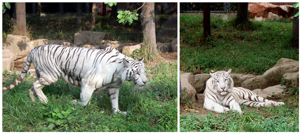 上海野生动物园白虎馆于2001年7月建馆展出,现有1雌1雄2头白虎,另外在2003年10月22日,白虎产下3只幼仔,其中一头因体质较差死亡,另2头现在人工哺育室进行人工哺育。