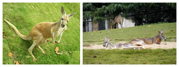 袋鼠是澳大利亚的国兽,袋鼠是有袋类动物,和胎盘类动物一样,是哺乳类动物,2500万年前,有袋类动物几乎从地球上消失,仅在澳大利亚及巴布亚新几内亚生存,袋鼠面貌象老鼠,雌袋鼠身上有一个育儿袋以便哺育无法独立生存的小袋鼠,袋鼠虽有四肢但前肢短小,后肢发达,以草为食,与人友善,袋鼠习惯用后肢跳跃前进,时速可达60公里。上海野生动物园袋鼠区共展出4种袋鼠计40只:灰大袋鼠、赤大袋鼠、红颈袋鼠、白袋鼠,在饲养人员的精心训练下,游客可靠近袋鼠饲喂袋鼠,也可摸摸袋鼠宝宝,还可握握袋鼠妈妈的手,与它们合影留念,如果你来的时候恰逢袋鼠宝宝从妈妈的育儿袋中探出小小的脑袋,舔吃你手中的食物,相信你此刻的感觉一定美极了。