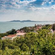 地图小鱼山公园是青岛较好的风景眺望点之一,一是因为它位于市中心,是青岛离海较近的一座山,地理位置较好;二是因为它的海拔仅60米,爬山不累,登到山顶能看到“红瓦绿树,碧海蓝天”具青岛代表性的景色。小鱼山山顶有三层八角阁览潮阁,高18米,顶覆绿色琉璃瓦。沿着盘旋楼梯登阁观景,近处是一幢幢掩映在绿树中红瓦黄墙的德式建筑,往东南能见到第一海水浴场金色的沙子接连着蔚蓝的大海,往东北能见到太平山上的青岛电视塔,往西天气好时能分辨出远处的小青岛和栈桥,往北能拍摄到信号山公园的全景,信号山山腰上的迎宾馆和山顶三幢红顶蘑菇楼清晰可见。晚上则可以在山上拍摄青岛市的夜景。览潮阁西边有六角亭碧波亭,东边有四角亭拥翠亭,同样顶覆绿色琉璃瓦,都能观景。连接着览潮阁和拥翠亭的曲廊正面,有白色浮雕,现代字“小”、“山”和古老象形文字“鱼”构成了小鱼山的山标,你可以和它合影,山标旁还有漂亮的壁画。此外,小鱼山的南坡,有将青岛建筑集中起来的微缩模型,感兴趣的话也可以看看。小鱼山公园附近景点众多,基本都沿着海岸线,往西你可以按栈桥-海军博物馆-小青岛-鲁迅公园-小鱼山公园的路线来游览,往东可以看看康有为故居,第一海水浴场,八大关,后到太平角看日落。
