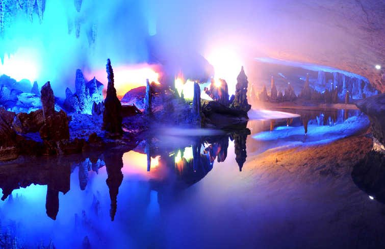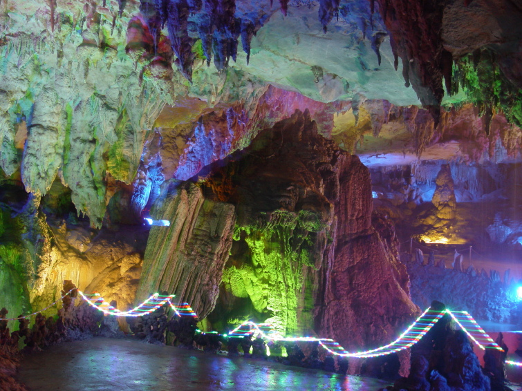 古生物貘化石牙床是世界之最,让我们体会到什么叫沧海桑田,什么叫光阴一瞬,此为第一宝。莫测的神龙见首见尾不见身,巨大的龙头,龙眼、龙角、龙牙清晰可见,口含煜煜龙珠。两条神龙的对面则是两只目前桂林开发岩洞中最壮观的雄狮。它们昂着头,与两条神龙对视着。这就是洞中的第二宝:龙狮护宝。第三宝“石松玲珑塔”,它在桂林所有的岩洞中绝无仅有,把太湖玲珑石的皱.透.漏.瘦体现得淋漓尽致!