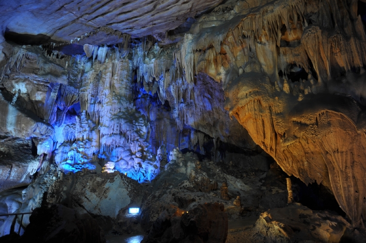 第一绝是洞顶飞流地质奇观。岩洞顶壁悬挂水珠状,仿佛无数清流飞腾而下。清流冲积出一片俨然沙漠的钟乳石,还有一座座城堡,构成第二绝--洞穴雅丹奇观,显得那么的壮丽、雄浑、怪异和神奇。洞内的第三绝是“石头开花和鹅管”。铁树开花已是难得一见,石头开花更为难得,需要上万年的时间才能形成我们今天所看到的规模。还有一种水滴而成的、极似玻璃管的钟乳石,一支支悬挂在岩壁上,像倒挂的水晶灯饰。