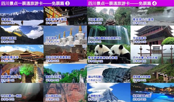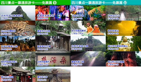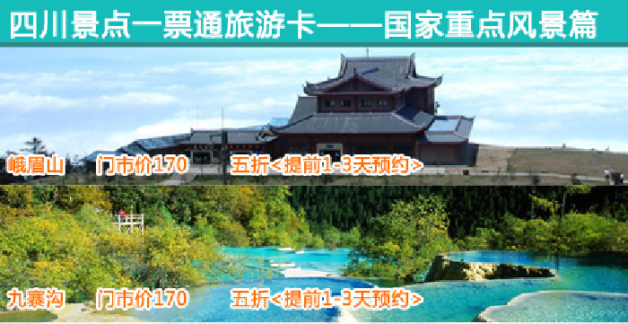 四川——地处中国大西南,肥沃的土地,丰富的自然资源,悠久的历史和绚烂多彩的少数民族文化,构成了多样性的自然和文化旅游资源。她拥有2处自然遗产,1处自然文化遗产,9处国家级风景区。被列为国家重点风景名胜区的有:峨眉山、青城山——都江堰、黄龙——九寨沟、缙云山、剑门蜀道、蜀南竹海、贡嘎山等处。而四川景点一票通旅游卡已占据2个国家重点风景区。