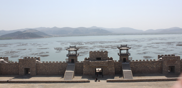 山寨建在湖平面22米高的的悬崖上,南北长136米,东西宽132米,气势雄伟,蔚为壮观,建有一关、二关、三关、忠义堂、议事厅、瓮城、点将台、擂石阵。水寨中有古战船10艘,瞭望台2个,水上平台3600平方米,是水军作战基地,并以吊桥和天桥平台与山寨连接,水寨周围有万亩天然湿地,芦苇丛生,是当年水浒英雄操练水军,奇袭官兵之处。