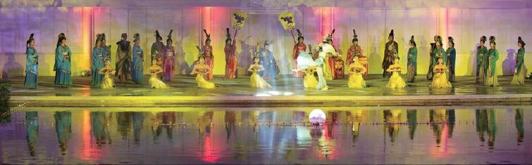 亮点二:倚山为幕,临水为台,视野开阔,集山水之精华,融山水为一体。舞台左侧水车缓缓转动,右侧山泉淙淙流淌,一群少女翩翩起舞。观众同山水零距离接触,同演员近距离互动。山是舞台的大背景,移情换景,使整个山脉成为一幅巨大的天幕;以水为舞台,带您感受江南水乡的魅力。