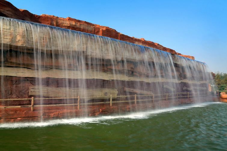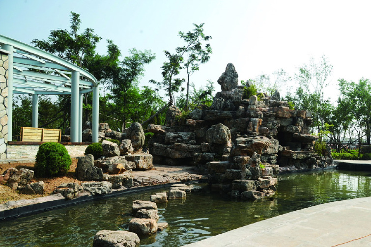 【高山流水】--即山地园林区,位于北部展区外围。以人工方式堆山造景,山高控制在4-8米,主入口处巍至三十余米。其在改善区内小气候的同时,也增加了地形的丰富性与趣味性,并将成为核心园区的葱茏背景。该区绿波起伏、飞泉跌瀑,奇幻山中更是别有洞天。