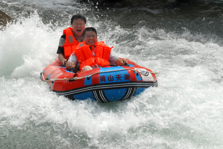 水上娱乐 天湖景区内有两条河流流经,一为天竹溪,其源自海拔1184米的天湖,流经峡谷,与源自黄山最高峰莲花峰与天都峰的天河在景区内交汇,并入香溪。现已在景区内的天河河道上建成天河谷漂流,漂流总长1.9千米,其水量丰富,河水清澈见底,水质优良。河道两岸风光旖旎,山体葱翠,翠竹夹岸。漂流以橡皮艇冲浪为主打项目,上下落差29米,沿途不仅可以欣赏到美丽的风景,更能感受到原生态漂流带来的刺激与快感。在漂流的下站,还设有水上体验带,内有水上攀岩、蹦床、水上滚筒等一系列水上娱乐项目。在山谷深处,能够享受戏水带来的刺激与满足。