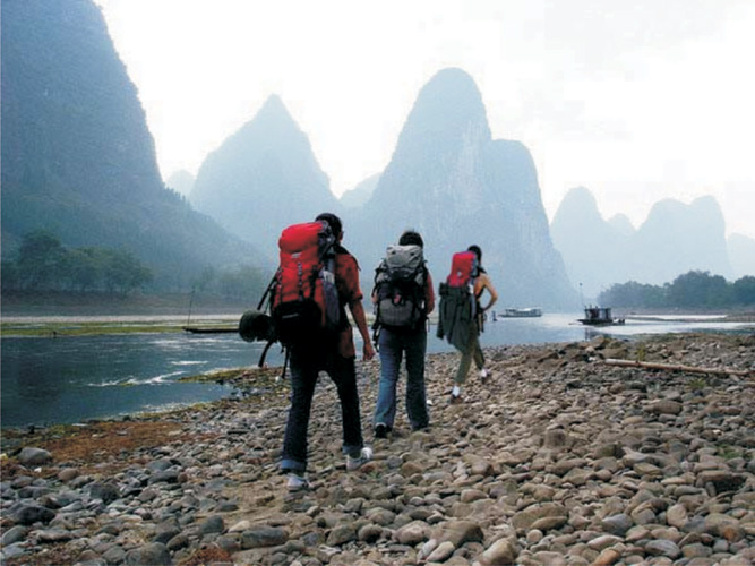 九马画山峡谷漂流景区距漓江仅300米,静静的漓江缓缓而过,沿着漓江向下游走去,一路都是漓江上的美景,如青蛙跳江、乌龟爬山、八仙过海、老人守苹果、下龙风光、等等,穿过江边的树林,穿过青青的田野,走过翠绿的竹林,大坪村越来越远,不到半个小时,九马画山就在眼前,大自然的笔墨奇观在九马画山体现得淋漓尽致,放眼望去,竟成了一幅“只应天上有,人间难绘成”的“九马”画,它临江而立,石壁如削,奇山峻岭,景致迷人。