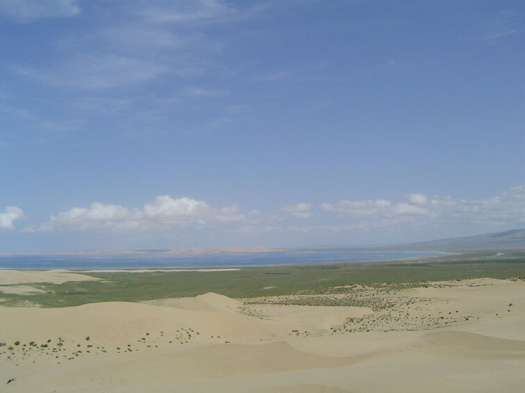 月牙湖面积0.3平方公里,海拔比青海湖稍低,属于淡水湖。月牙湖还有一个好听的名字,叫响淖尔,意思是响动的湖。月牙湖北侧的沙山形似元宝,故称作元宝山,山前供有藏财神唐卡,喻为“元宝进财”。