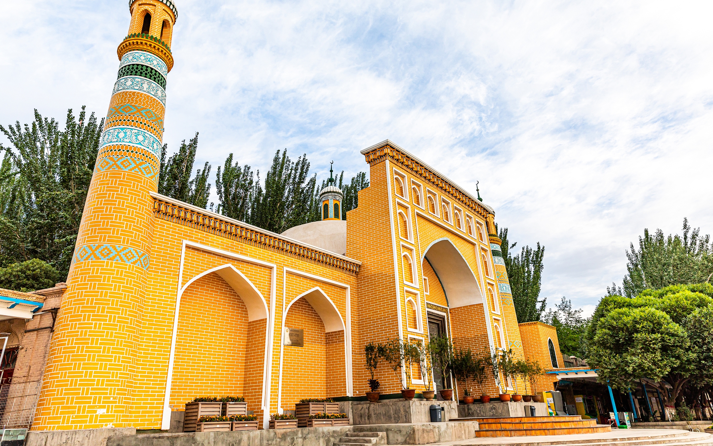 艾提尕尔清真寺位于喀什老城区中心,是规模大的清真寺之一。寺内有很多气势壮观又富伊斯兰特色的建筑,可以一一参观。而每天五次礼拜场面时在寺外见证,更是可以看到规模盛大的礼拜场面,感受浓厚的宗教氛围。清真寺是一座庭院式的寺院,寺院东侧正门口便是巨大的喀什艾提尕广场,是喀什市的标志。平时在大广场上有很多人在此休闲游戏,长胡须的老爷爷和小孩一起在广场边闲坐晒太阳,非常的休闲,场面也很安然。广场的西侧是清真寺的东门,即清真寺正门门楼。正门是鹅黄色的建筑,旁边是两座宣礼塔,弧形的造型柔和静美,寺门上挂着巨大的写有阿拉伯文清真言的牌匾。很多游客会在此拍照。从东门处购票进入清真寺之后便可观赏清真寺的院内,院内面积很大,横竖都有一百多米,种植了众多的树木,使得整个清真寺都在绿荫之下,在干燥的喀什是难得的清新舒服的地方。院内有礼拜堂、讲经堂、拱北孜等十几座建筑,以绿色为主色,每一座都很有伊斯兰风情。中间还有水池花木等。为主参观的建筑便是礼拜堂,位于寺内深处,礼拜堂长有一百多米,以绿色为主色,有一百多根七米高的绿色大柱支撑,里面一排排的坐垫便是礼拜的场所了。走进内殿可以看到里面没有任何的人像等。在院内走一圈参观完寺院建筑后便可回到东门离开。到艾提尕尔寺观光,除了观看寺内的建筑,重要的其实是见证盛大的礼拜场面。每天寺内都会进行5次礼拜,礼拜时寺院不开放,但是可以在寺外见证。每次礼拜之前,寺院的广播会播放宣礼的唱经声音,悠远空灵。之后便会有两三千人在此礼拜,寺内无法容纳便有很多人在寺旁和广场上进行仪式。场面盛大而又安静,给人心灵的震撼。每周五是伊斯兰教的主麻日,这里的礼拜人数更是会达到六七千甚至上万,场面非常壮观。另外,每年伊斯兰的古尔邦节、开斋节等传统节日时,会有远近数万名人在这里欢歌跳舞庆祝节日,如果正好赶上一定要见证一下。