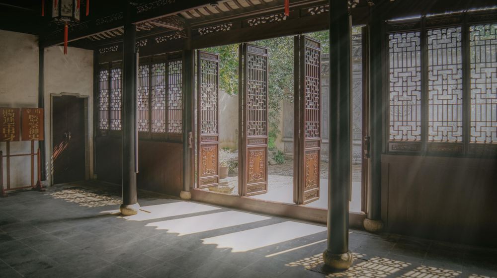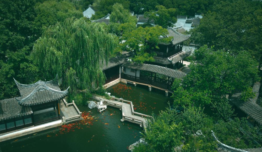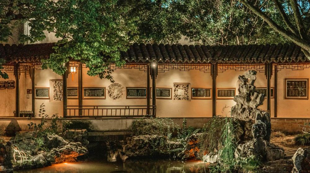 茹古斋北,住宅与宗祠、花园间有小浜兜通外河,浜底置船坊,浜上架拱桥。这里是宅院与花园间后部通道,闻香读书楼、厨房均有通浜小门,知音斋和水流云在轩北的“东溪小筑”也通浜。前部从玉兰堂院过“撷秀”门,即入茹古斋小院。整个景园的空间组织和景观安排过渡自然,叠山理水,营造出自然意趣的“城市山林”。