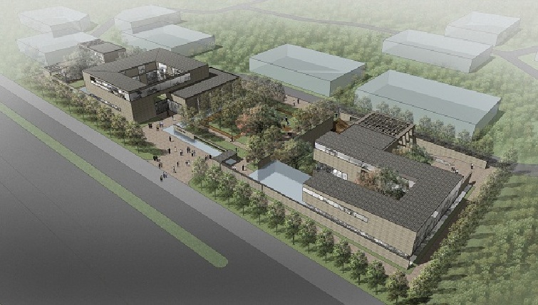 主展馆建筑设计方案名为"生命之源",以跨度75 米的主展厅为源起,螺旋状的生长、传播、辐射,最终融合于园区的景观之中。同时,设计中渐次绽开的构造和起伏变化的天际线赋予了建筑丰富的表情,通过人视点欣赏主展馆,宛如一朵花姿绰约、四季倾城的月季花盛开在碧水丛林之间。