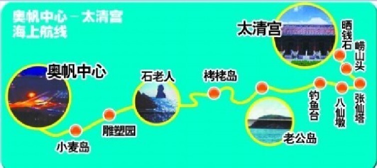 艇上游览景点:奥帆中心(上船点) - 麦岛 - 雕塑园 -石老人- 栲栳岛 - 老公岛- 流清河 - 伏熬巨石 - 青蛙石 - 八水河 - 崂山太清宫码头(下船点)