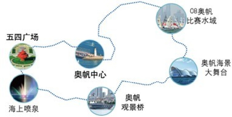 游览景点:奥帆中心-五四广场—海上喷泉—奥帆观景桥—奥帆海景大舞台—08年奥帆比赛水域—奥帆中心,