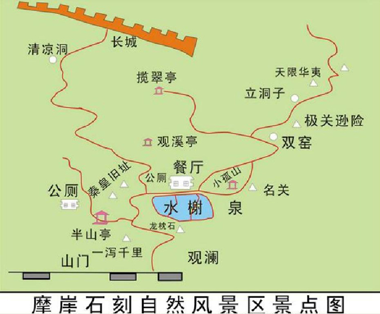地图北京摩崖石刻自然风景区位于北京市怀柔区渤海镇,距离北京市区60公里,与慕田峪长城相连。是集历史仿古、摩崖石刻、山水生态酒店服务为一体的自然风景区。占地面积7500亩,植被覆盖率达90%,景区内有明代兵站要塞和古长城遗址,相传明代之初,因勘察有误,一段长城修到这里截然而止,从而成为北京有名的“错长城”,俗称“耷拉边”。