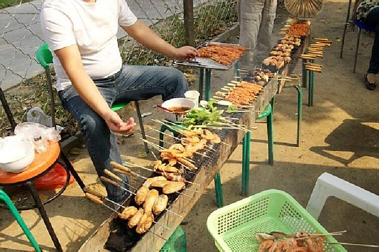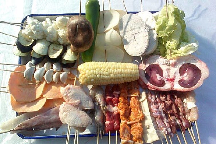 烤串有羊肉串、羊肉筋、板筋、鸡珍、火腿肠、鸡肉串、鸡翅、鸡心、尖椒、大蒜、土豆片、地瓜片、馒头片、四种凉菜、四种主食。